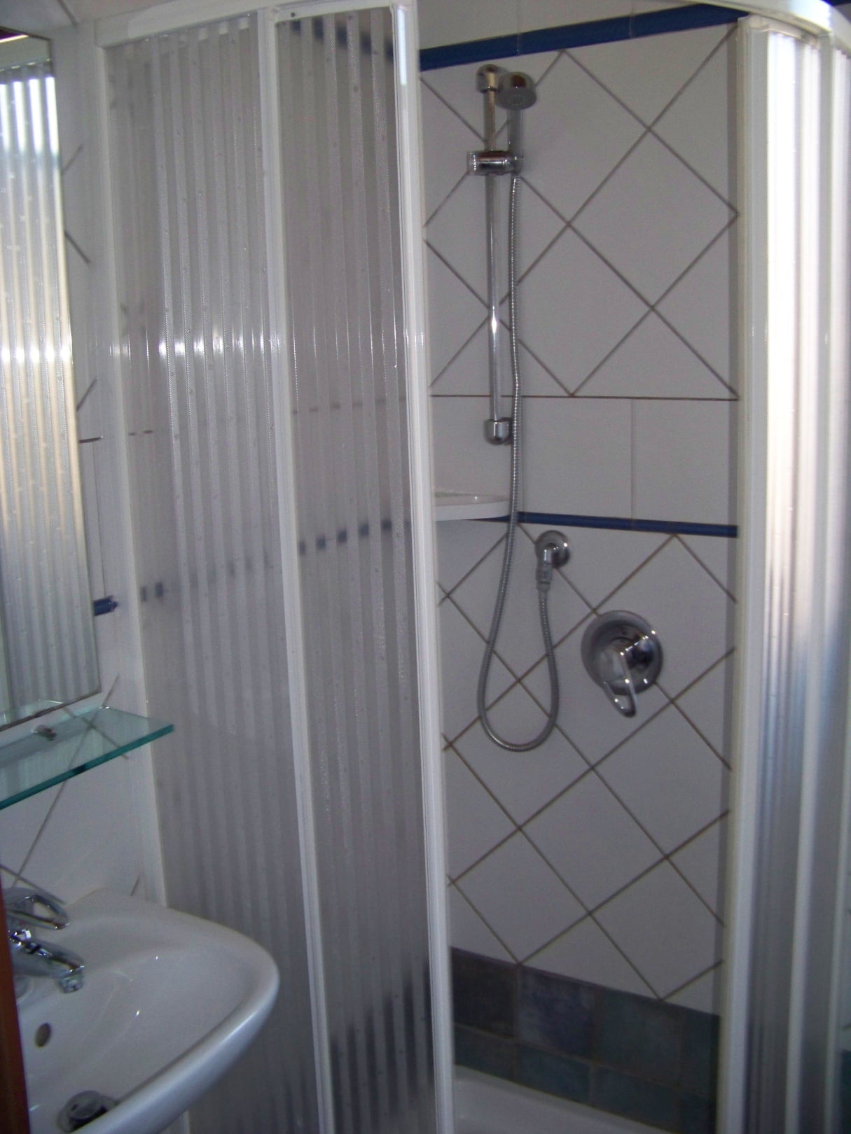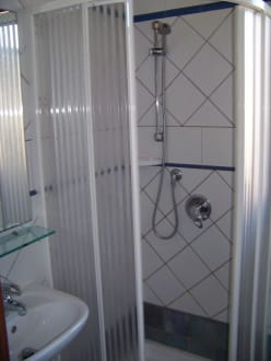 Dusche und Waschbecken im hinteren Badbereich