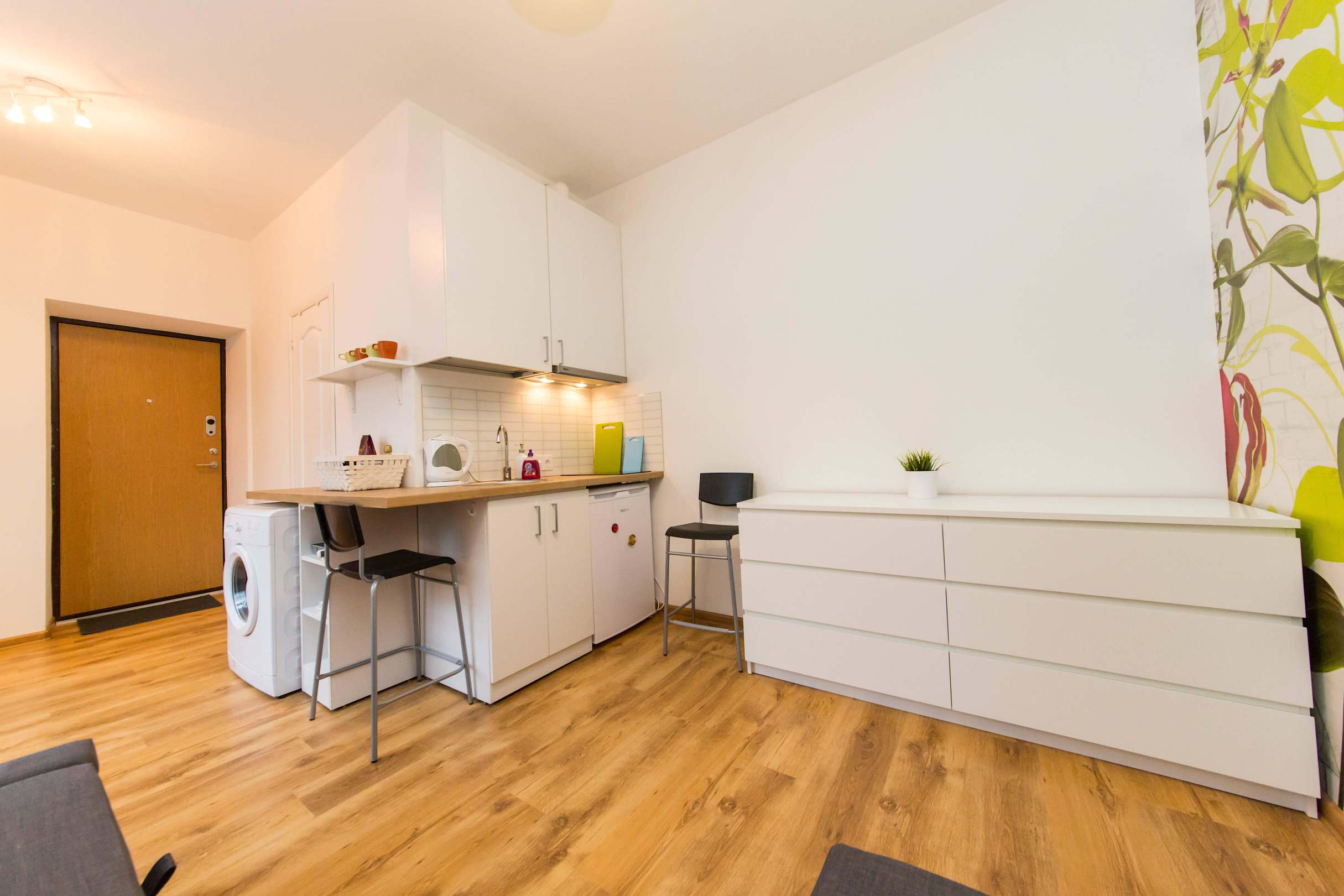 Kitchenette, dining area, washer, entrance door