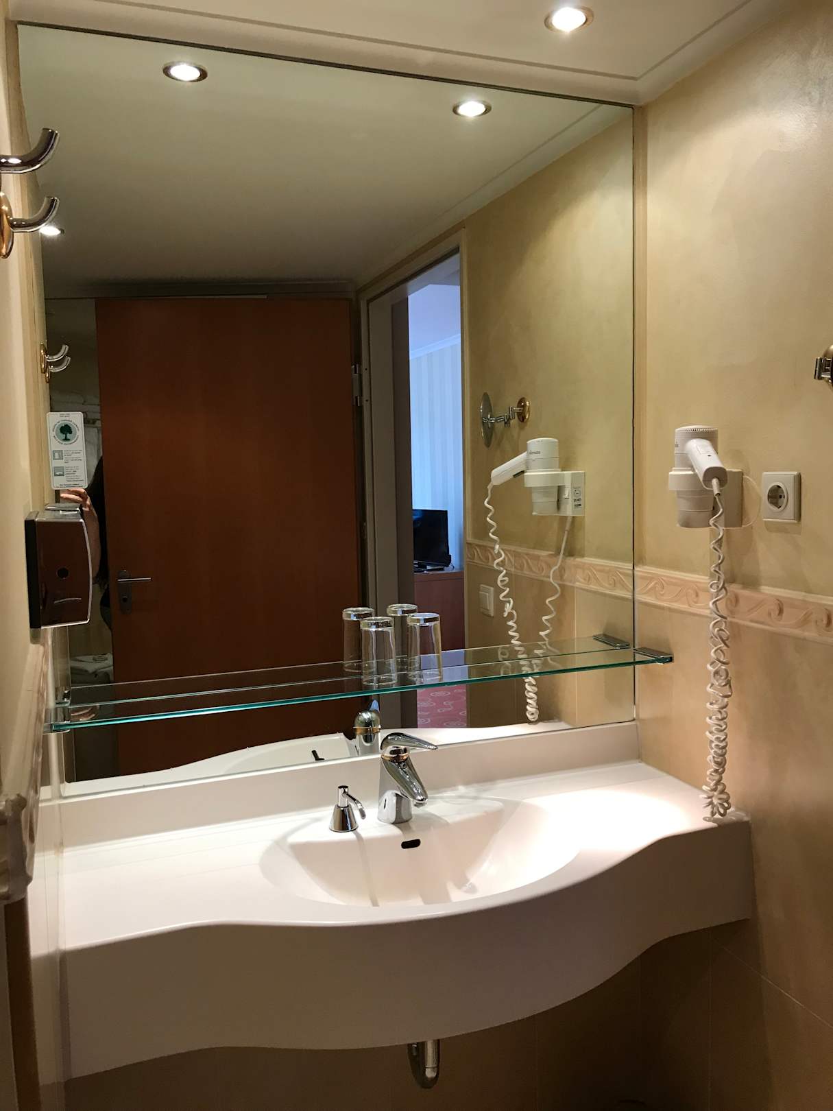 ZimmerBlick zum Waschbecken, links ist die Dusche. Schminkspiegel fehlte mir (zum Einsetzen meiner Kontaktlinsen).