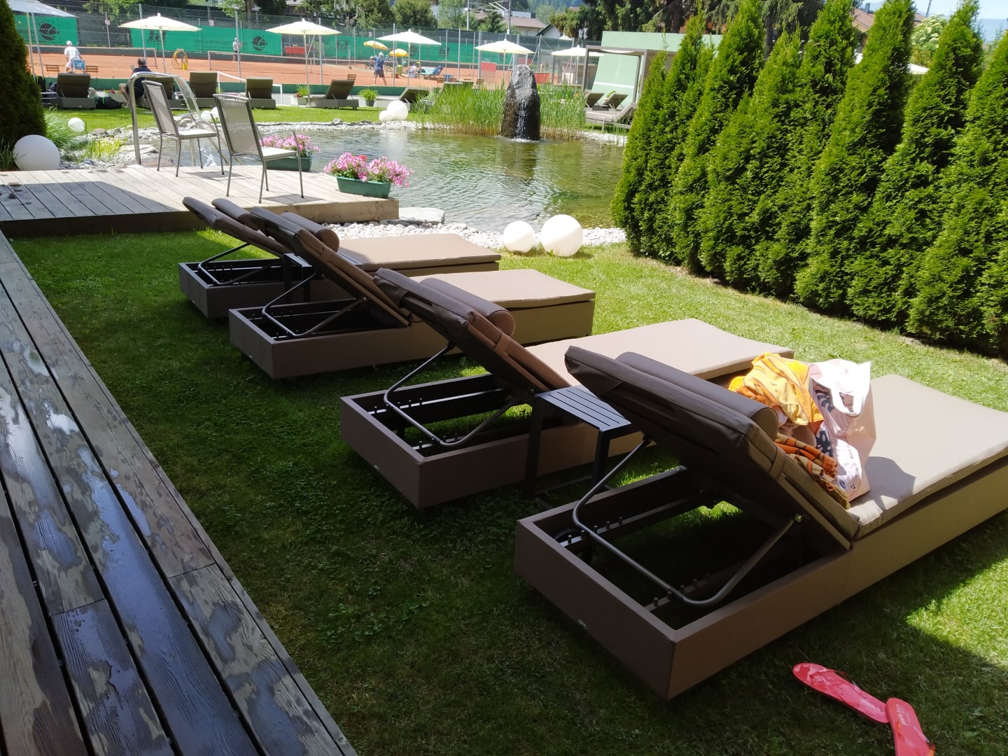 Tolle Liegen mit Badeteich im Hintergrund