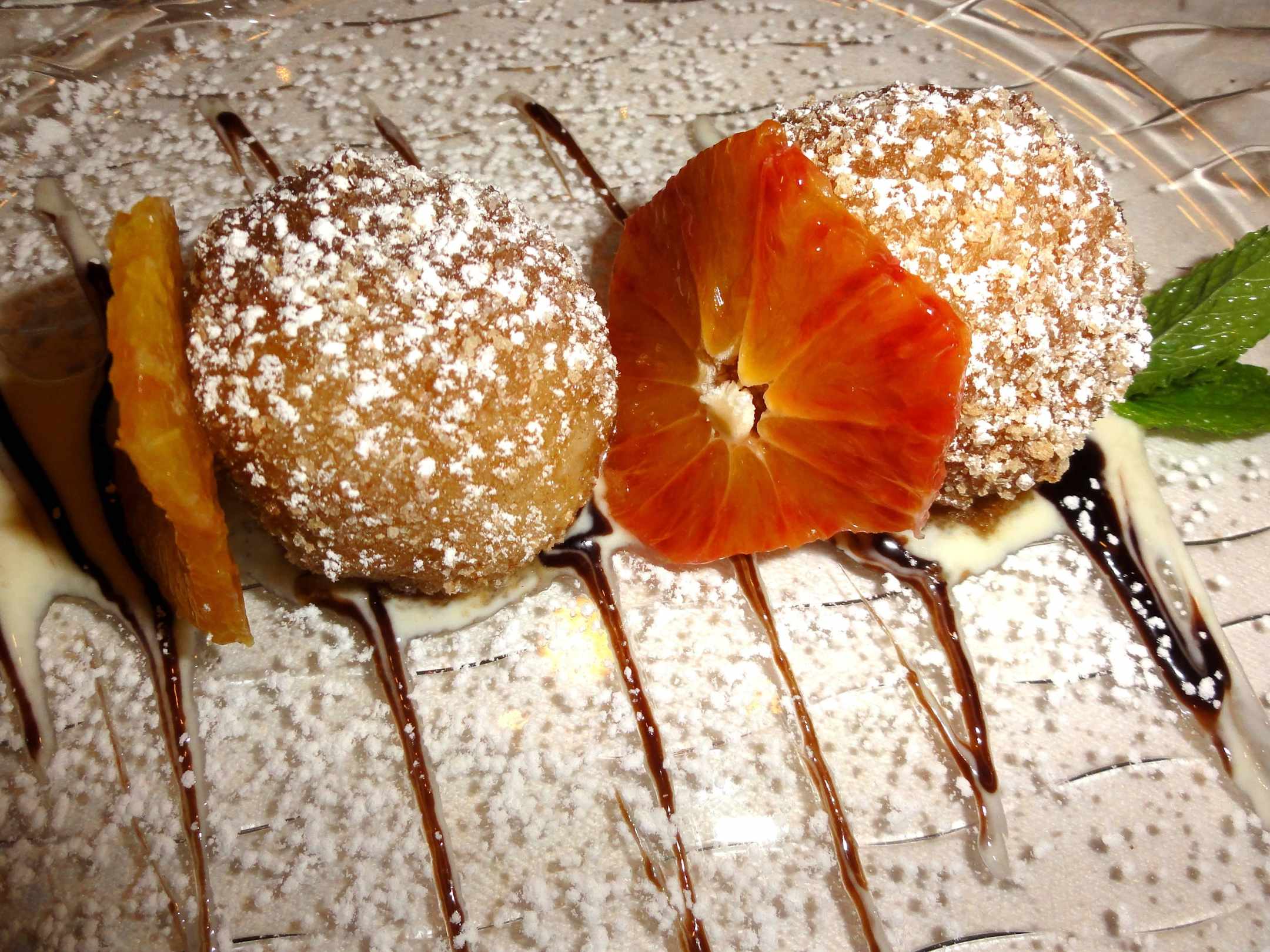 Nougat-Topfenknödel auf Orangencarpaccio