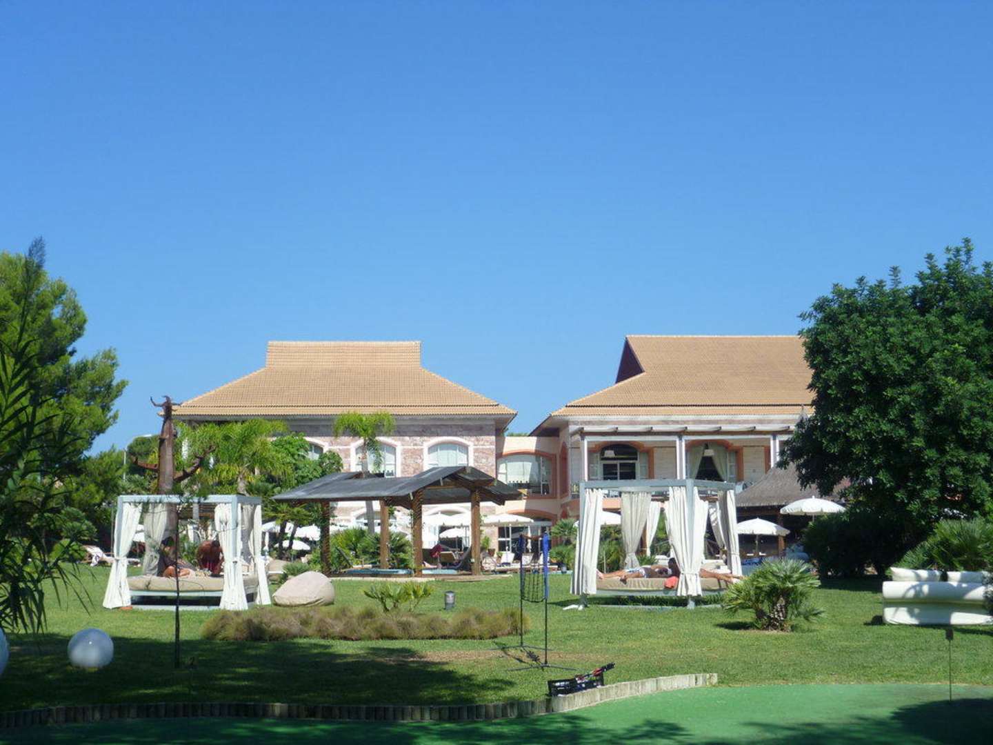 Empfangshalle und Restaurant Empfangshalle/Spabereich und Restaurant vom Garten aus gesehen