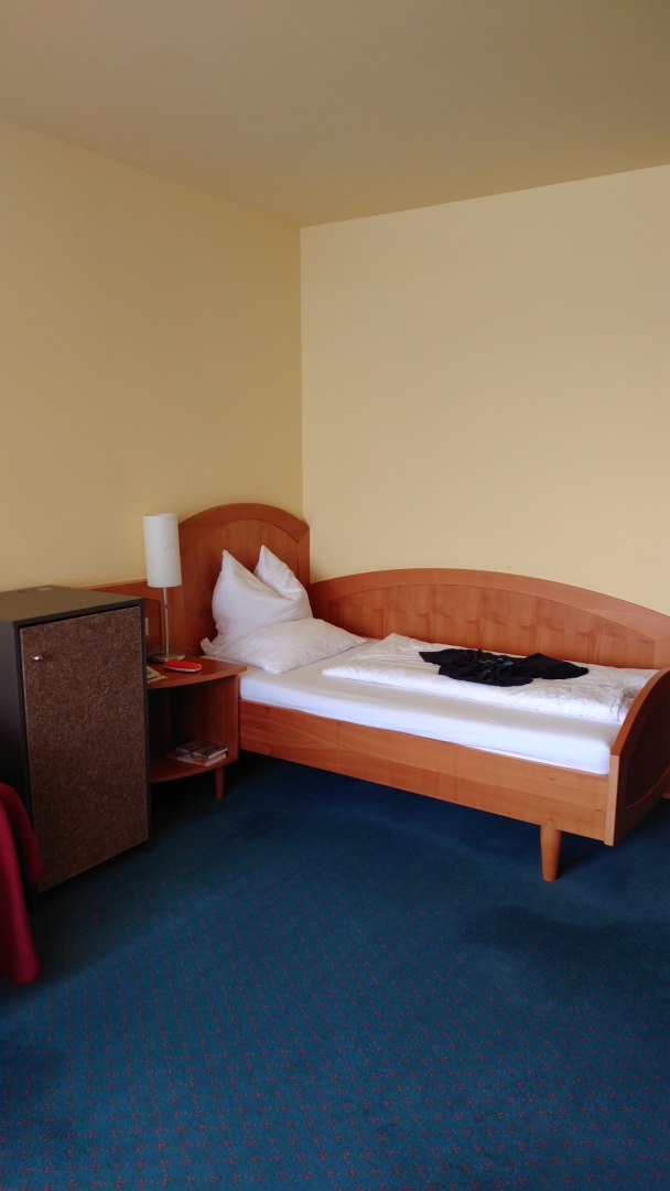 Einzelbett mit neuem Kühlschrank daneben