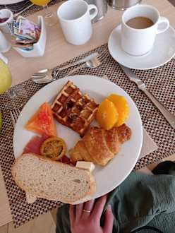 Frische Waffeln zum Frühstück + Sojamilch vorhanden