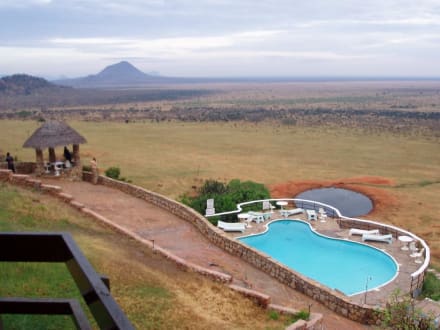 PoolBlick von der Hauptanlage zum Pool mit der Wassertränke und der Savanne im Hintergrund. Oftmals tummeln sich da Herden von Elefanten.