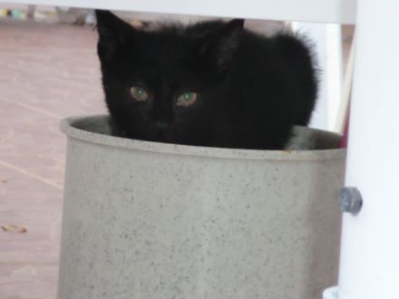 Katze holt sich ihr Futter- Mülleimer am Pool