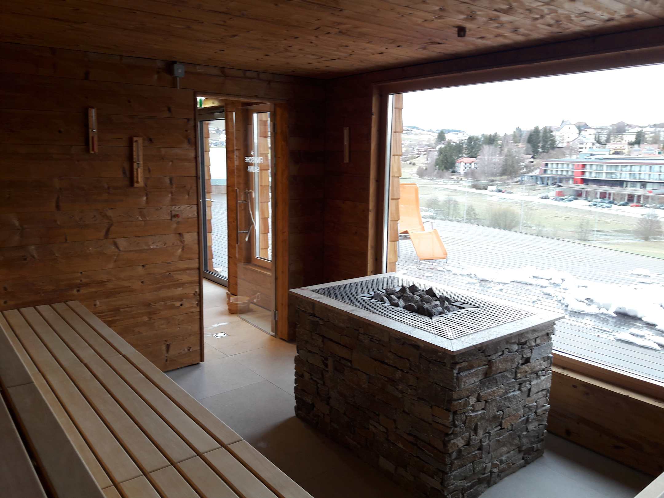 finnische Sauna mit großer Terrasse und Panoramablick