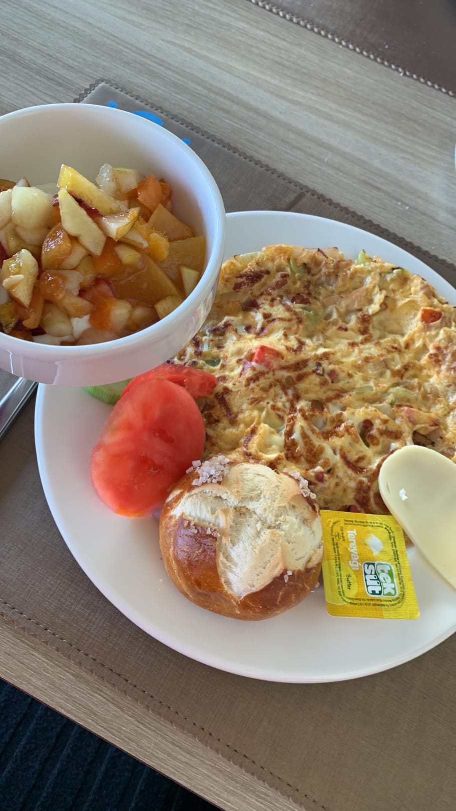 Omelette, Laugenbrötchen (schmeckt wie in Dland) & Obst