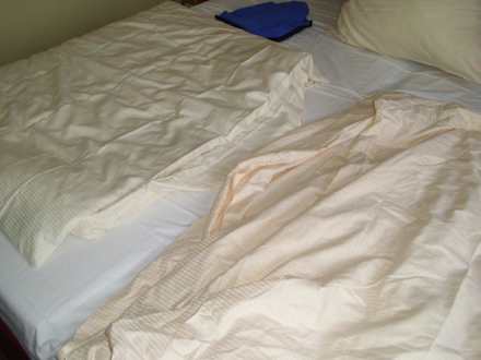 Bett mit unterschiedlicher Bettwäsche