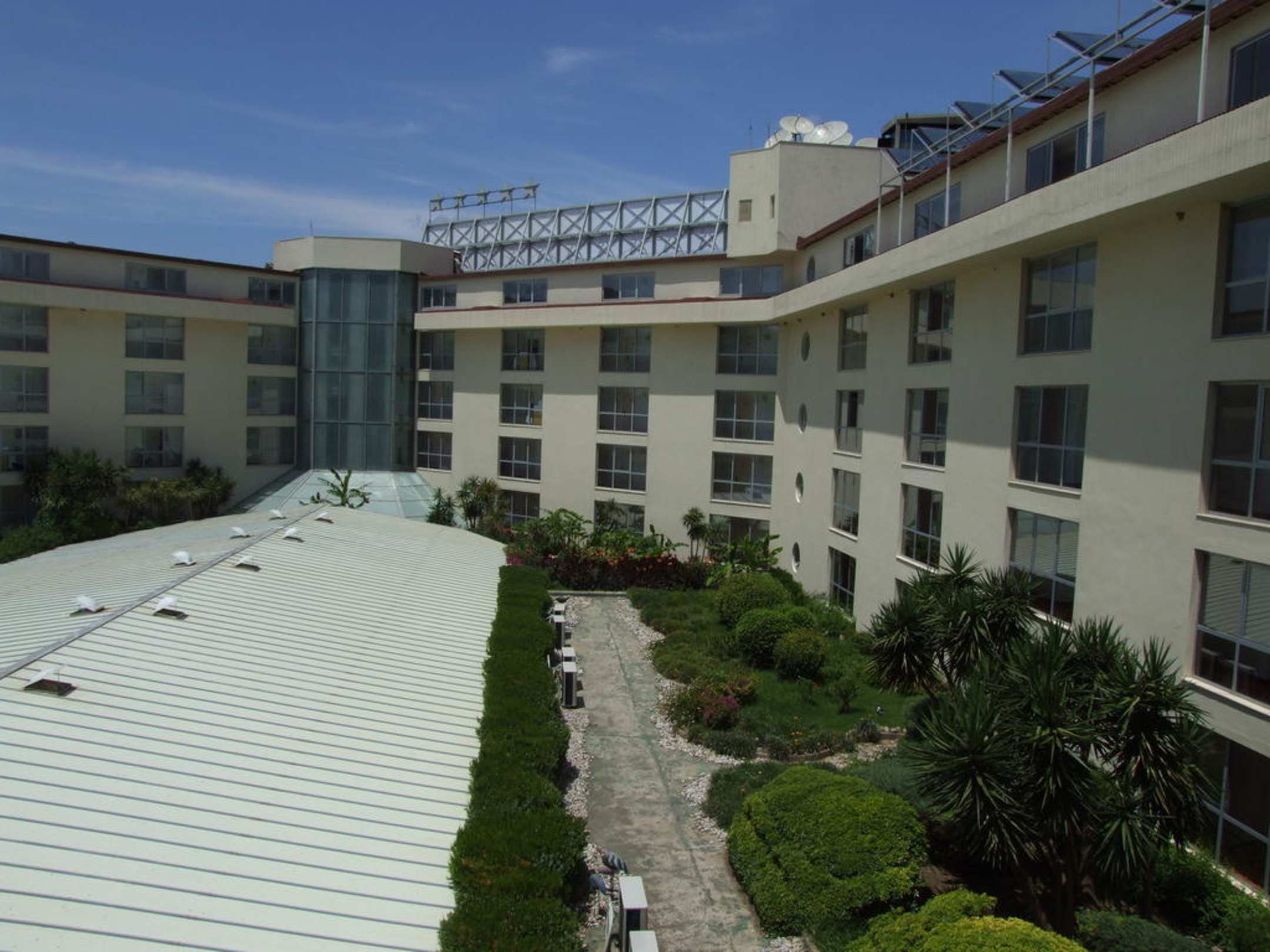 Der Innenhof des Hotels. Das große Dach ist der komplette Bar und Essensbereich