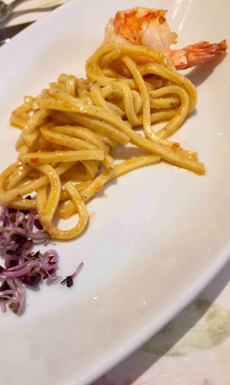 Abendmenü: Vorspeise "Riesengarnele mit Spaghetti-Pesto"