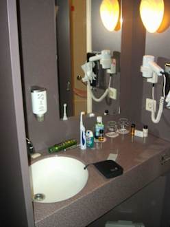 Hier eine kleine aber passende Ecke um sich einer Katzenwäsche,Mundhygiene zu vollziehen. Zur re.Seite gehts in den Dusch/Wannen/Toilettenbereich.Auch für Stabile Leute kein Problem.