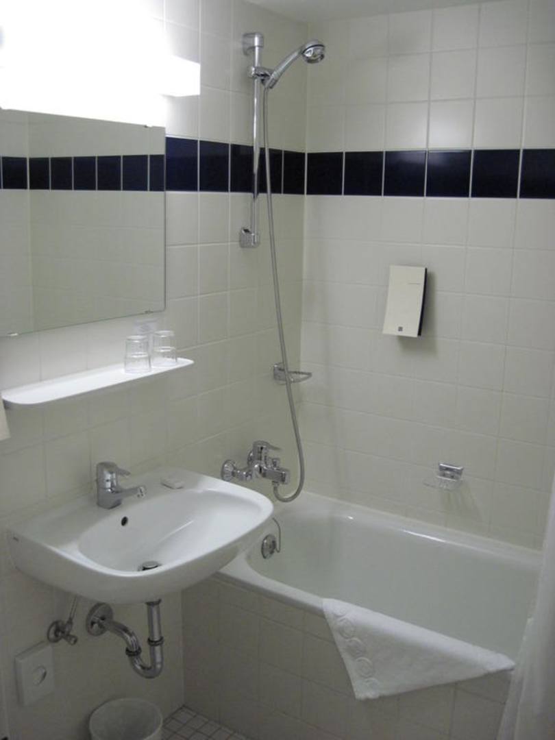 Badezimmer mit WanneDas Badezimmer ist Standard und am Waschbecken hat man wenig Ablagefläche für die eigene Kosmetik.