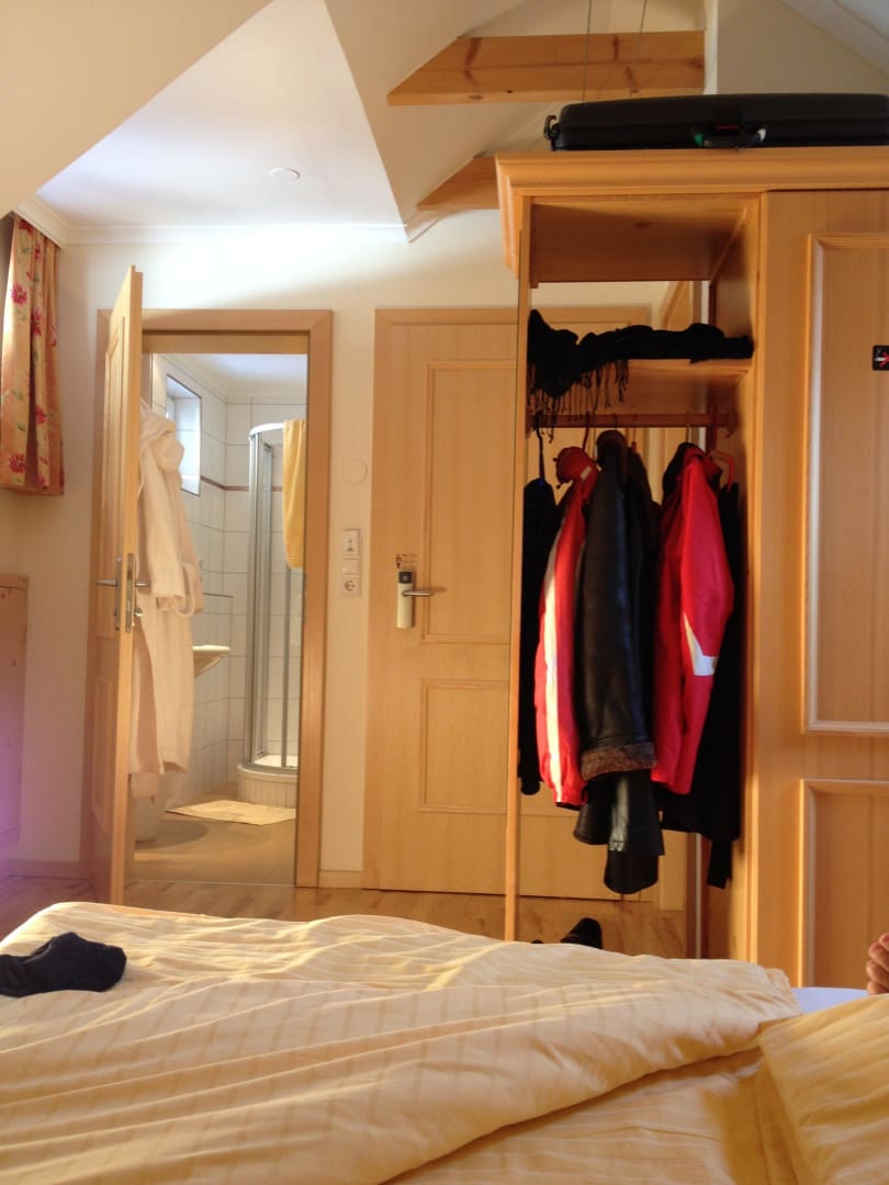 Zimmer und Blick ins Bad