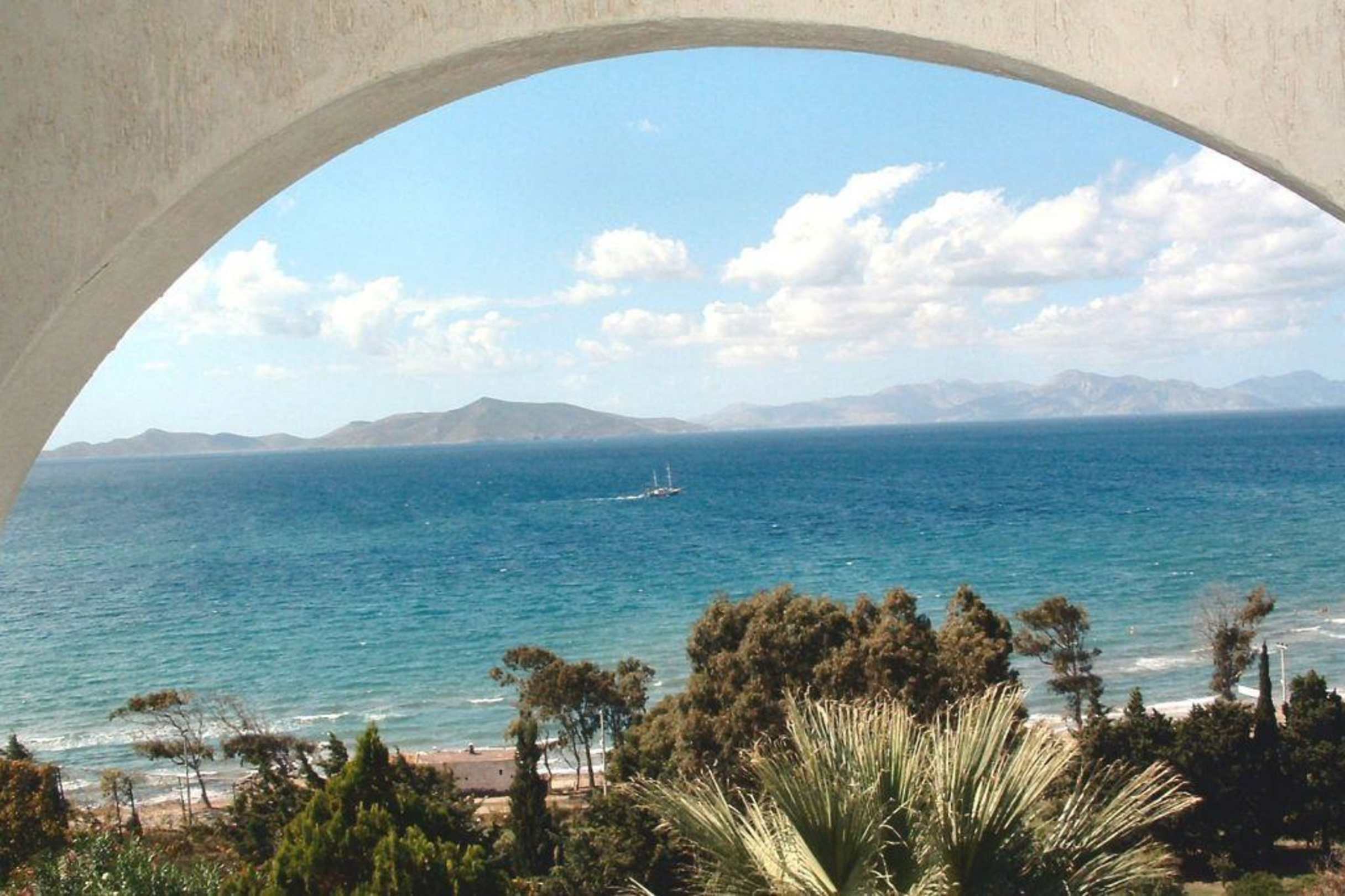 Das war unser direkter Zimmer-Ausblick. Vorne der Garten, dann die Ägäis mit den vorgelagerten griechischen Inseln