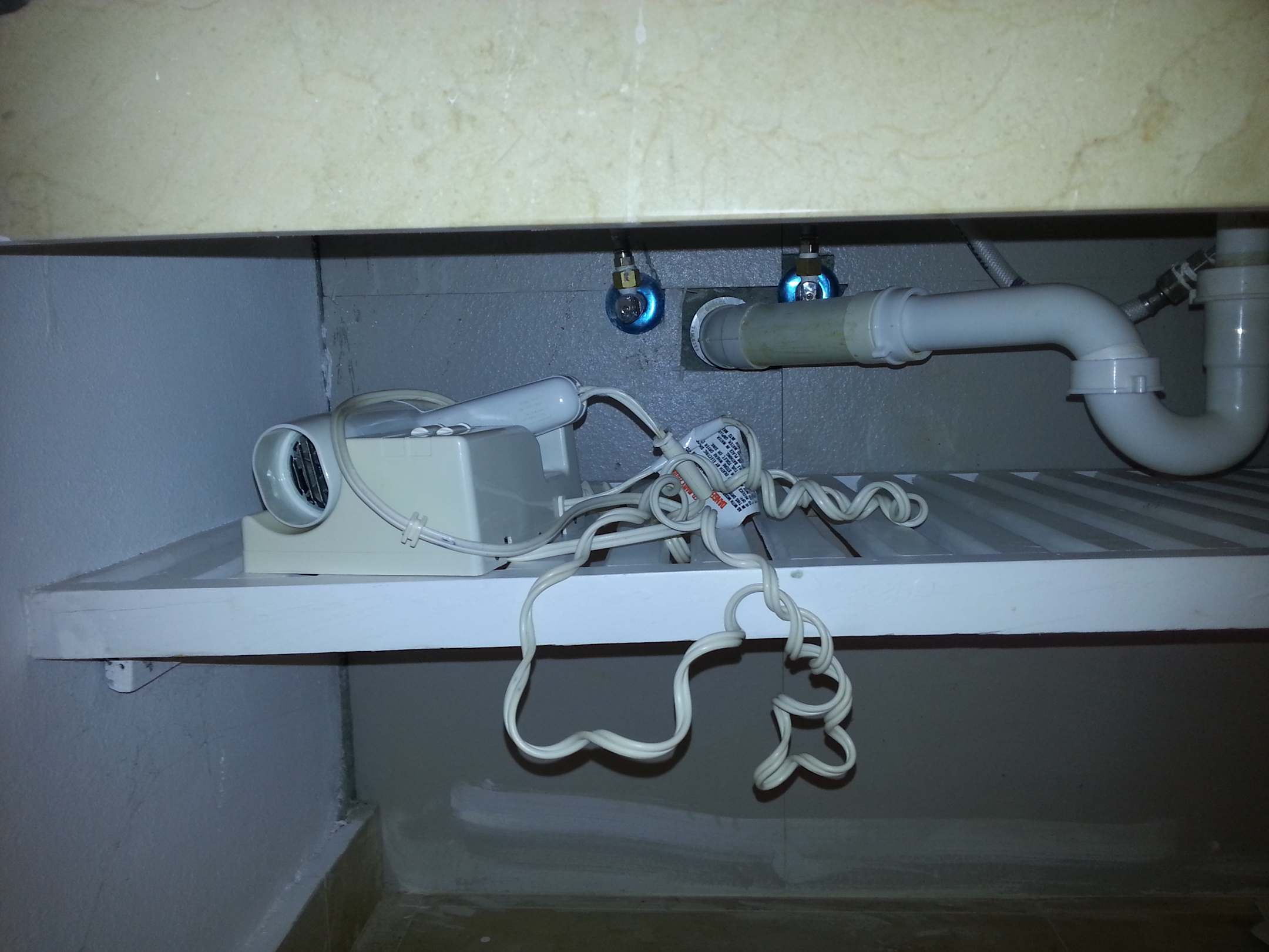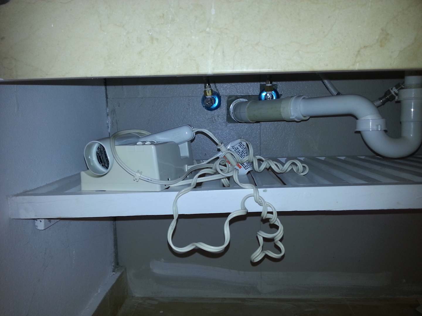 Der Haarföhn liegt lose unter dem Waschtisch