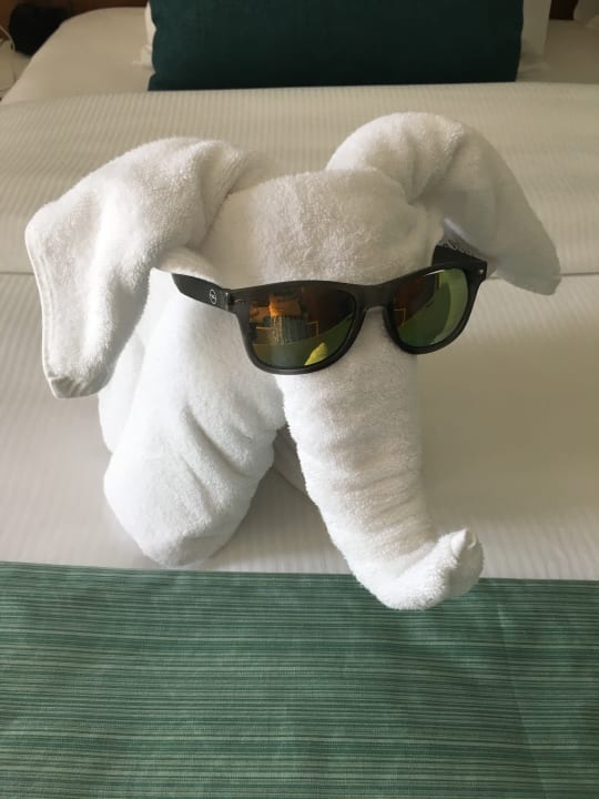 Der Zimmer Service arbeitet sehr ordentlich und bekam dafür natürlich ein Trinkgeld von uns. Als wir wieder kamen in das Zimmer saß dieser kleine Kerl auf dem Bett mit meiner Sonnenbrille :)