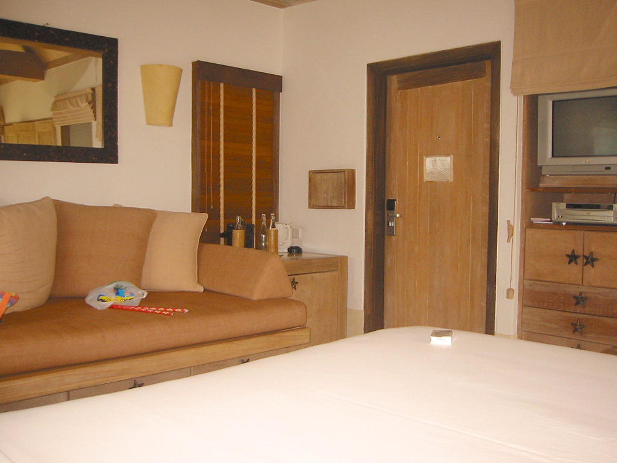 Pool VillaInnenansicht vom Bett aus mit Eingang, Couch, TV und HiFi-Anlage