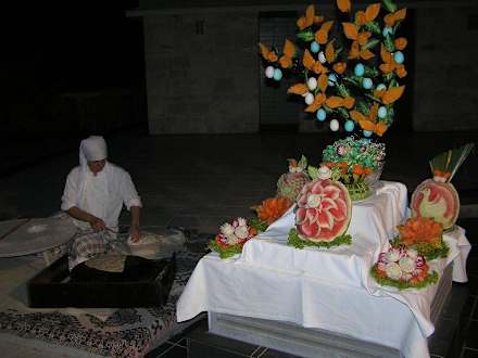 Backvorführung am BuffetJa hier wird wieder ein dünnes Fladenbrot mit Füllung gebacken, daneben verzierte Kürbisse