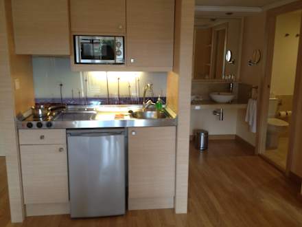 Küche mit offenen Waschbecken, rechts das Bad