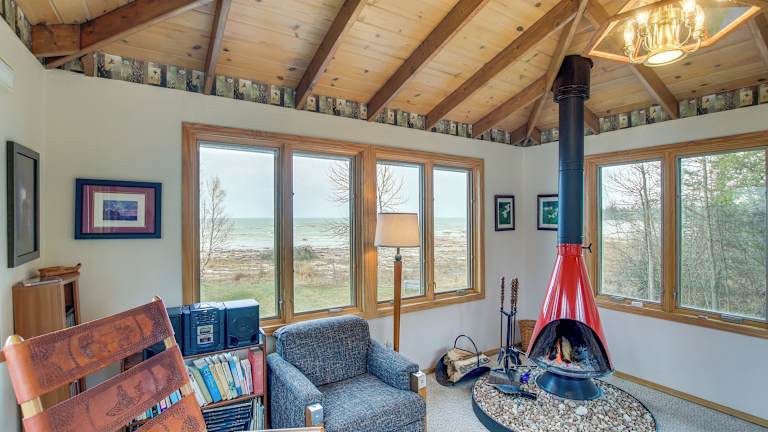 Serene Lakefront Baileys Harbor Home with Deck! ist eine Unterkunft mit einem Spa- und Wellnesscenter und Blick auf den See. Es handelt sich um ein Ferienhaus, das über ein Wohnzimmer sowie eine voll ausgestattete Küche verfügt, die mit Kühlschrank und Ofen ausgestattet ist.