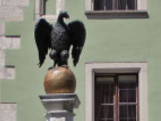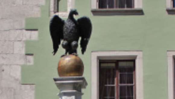 Zum großen Reichstag 1566 wurde der Adlerbrunnen gefertigt. Er besteht aus einem achteckigen Becken und Brunnenstock mit Bronzeadler. Mit dem Adler wird der Kaiser und mit der goldenen Kugel als Reichsapfel die Welt dargestellt. Er hat ein Renaissancedekor mit Ziergitter.