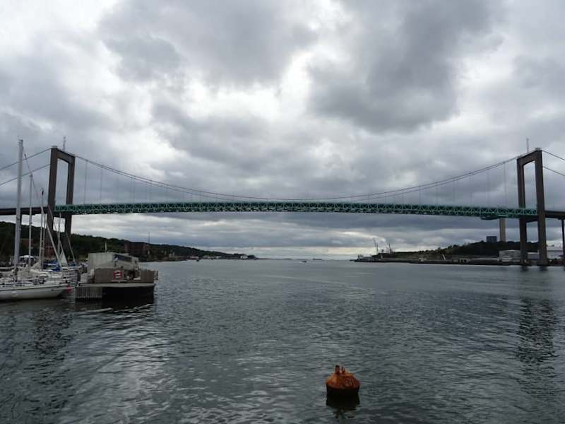 Die Hängebrücke an der Hafeneinfahrt von Göteborg stammt aus den 1960ern und verbindet Göteborg mit dem gegenüber auf einer Insel liegenden Industriegebiet. Da die Brücke "nur" eine Durchfahrtshöhe von 45 Metern hat und die heutigen Kreuzfahrtschiffe meist anscheinend höher sind, kommen diese nicht in den Hafen von Göteborg. Umgekehrt kommt der historische 4-Master "Viking" im Hafen aus dem gleichen Grund nicht mehr auf hohe See zurück - kommt ebenfalls nicht unter der Brücke hindurch.