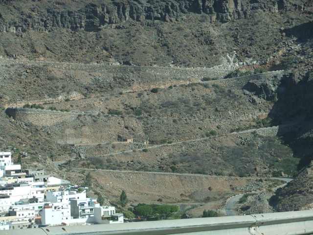 Diese Strecke ist beeindruckend wegen der Ausblicke, leider gibt es zu wenige Möglichkeiten, anzuhalten. Wir befuhren sie aus Richtung San Nicolas de Tolentino nach Agaete. Die Straße ist zunächst gut ausgebaut, hat allerdings teilweise sehr enge Kehren. Richtig eng und manchmal sehr steil wird es erst auf dem letzten Stück vor Agaete. Es ist zu empfehlen, sich sehr weit rechts zu halten, wenn man die Straße nicht überblicken kann. Einheimische, die die Strecke kennen, fahren schneller als erlaubt und schneiden die Kurven, es kann knapp werden, aber die Canarios sind sehr geübt im Ausweichen... Kritisch kann es auch werden, wenn einem ein Bus entgegenkommt. Trotz alledem scheinen recht wenige Unfälle zu passieren. Die Aussichtspunkte sind meist erst spät zu erkennen, schon deswegen sollte man etwas langsamer fahren, sonst ist man vorbeigefahren. Der erste Punkt ist der Mirador de Balcón. Hier steht eine Verkaufsbude und man kann ein Stück hinunterklettern, auf einer schönen, breiten Treppe. Schon bald danach kommt der zweite Aussichtspunkt Andén Verde, der leider nicht als solcher zu erkennen war. Er dient heute scheinbar als Müllabladeplatz. Alle anderen Aussichtspunkte sind nicht gekennzeichnet. Wenn man irgendwo unterwegs etwas länger pausieren will, sollte man Getränke dabei haben, denn außer an der Bude am Balcón gibt es nichts zu kaufen - und die ist entsprechend teuer. ACHTUNG! Die Straße darf bei Regen nicht befahren werden! Sowohl in Agaete als auch in San Nicolas stehen Schilder "en casio de lluvia..." Im Falle von Regen Fahrverbot.
