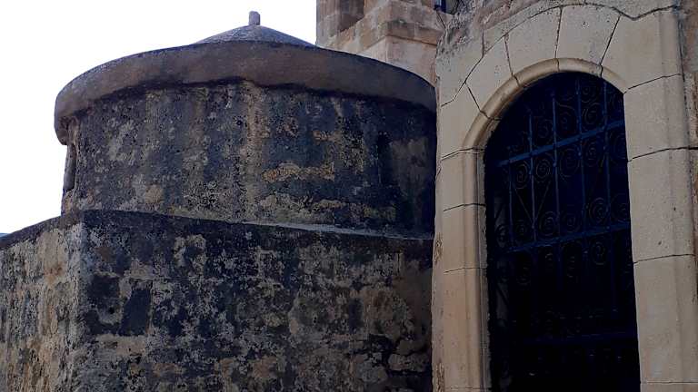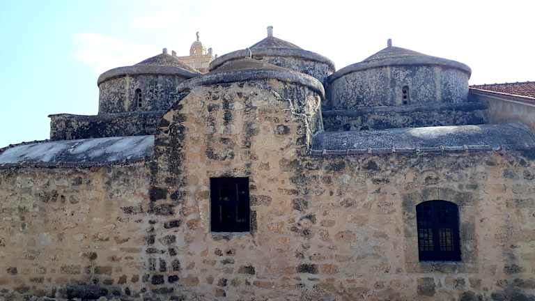 AgiaParaskevi in Geroskipou, close to Paphos, there lies the small church builtpresumably in the 9-th century with her 5 domes. It is a wonderful church from the Byzantine time with marvellous mural paintings and icons. A silver icon isconsecrated of the holy Paraskevi. Unfortunately, the church is only seldomopened and taking a photo is forbade in the interior. The Keyholder, so theoverseer is called, has an alert look at the visitors. Geroskipouis also known for his Turkish sweets in the place are offered.