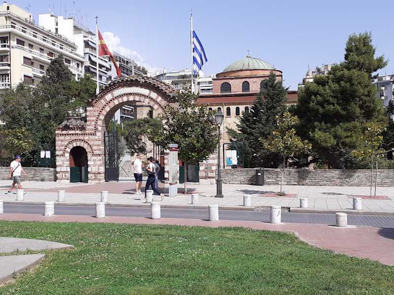 Die Kirche "Agia Sophia (Heilige Weisheit)" steht im Zentrum von Thessaloniki an der Kreuzung der gleichnamigen Straße mit der Ermou Straße. Das Gotteshaus wurde im späten 7. oder frühen 8. Jahrhundert als dreischiffige Basilika auf den Fundamenten einer bei einem Erdbeben zerstörten fünfschiffigen Kirche aus dem 4. Jahrhundert erbaut. Sie hat einen fast quadratischen Grundriss und im mittleren Schiff eine auf vier Säulen ruhende Kuppel mit einem Durchmesser von mehr als 10 Metern. Im frühen Mittelalter diente sie als Kathedrale von Thessaloniki. Von 1523 bis 1912 wurde sie als Moschee genutzt. An der nordwestlichen Ecke steht ein kleiner Turm aus dieser Zeit, der früher vielleicht ein Minarett war. Bei einem Brand wurde das Klerikalgebäude im Jahr 1890 stark beschädigt und zwischen 1907 und 1909 wieder restauriert. Die Eingangshalle wurde im Jahr 1941 bei einem Bombenangriff der italienischen Truppen weitgehend zerstört. Sehenswert sind die Mosaiken und Wandmalereien im Inneren, die aus unterschiedlichen Epochen stammen. "Christi Himmelfahrt" in der Kuppel ist das wichtigste monumentale Fresko des 9. Jahrhunderts. Die Kirche weist einige Ähnlichkeiten mit der Hagia Sofia in Istanbul auf, weshalb vermutet wird, dass die beiden Kirchen zeitgleich unter Justinianus entstanden sind. Im Jahr 1988 wurde das Gotteshaus zusammen mit anderen frühchristlichen und byzantinischen Bauwerken von Thessaloniki in die UNESCO-Weltkulturerbeliste aufgenommen. Homepage: http://www.agiasofia.info/