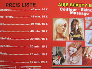 • Habe diesen Tipp als Empf. erhalten und auch getestet und es wäre schade wenn man solche Adresse nicht weiter geben würde, denn die Betreuung ist Herzlich schön und findet im guten deutsch oder engl. statt, der Haarschnitt super und Fönfrisuren halten auch länger, Massagen sehr zu empf. Fachliches Wissen wird hier ausgeübt zu fairen Preisen was aber nicht heißt das es Billige abzocke ist. Bin mit Rückenbeschwerden hingegangen (gekrochen)und nach ca 60 min Ganzkörpermassage inkl. Druckpunktmassage und Wärmebehandlung fast schmerzfrei nach der ersten Behandlung ("25,€) glücklich und zufrieden wieder in mein Hotel (SaturnPalaceResort) zurückgegangen, ich freue mich auch schon auf meinen 2´ten Termin den ich auch gleich fest gebucht habe. Ich lege Wert auf die saubere Qualität und nicht auf Quantität in der Werbung. AISE finde ihr gegenüber dem Hotel RoyalWings dieser kl. SHOP hält was er verspricht.