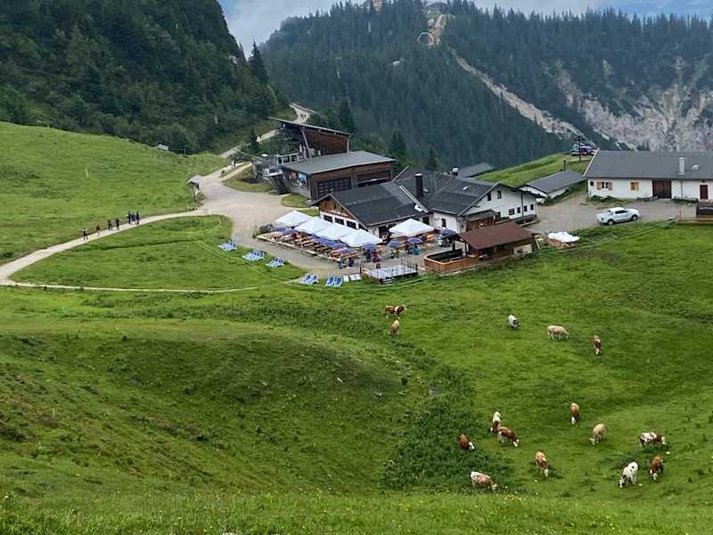 Ich bin bestimmt kein Freund von Bergbahnen, aber in diesem Fall würde ich tatsächlich empfehlen, mit der Bahn nach oben zu fahren und von dort aus weiter zu wandern. Der direkte Aufstieg von der Talstation, entlang der Rodelbahn bis zum Sportheim Böck ist unattraktiv, man läuft auf einer Teerstraße bzw. zumindest auf befestigten Wegen. So ein richtiges "Berg-Feeling" kommt hier nicht auf. Als Alternative kommt vielleicht der Wasserfallweg in Frage, da wir den allerdings nicht gegangen sind, kann ich ihn auch nicht bewerten. Der Weg vom Sportheim Böck (derzeit wegen Umbau geschlossen) zur Alpspitze und auch weiter zum Edelsberg bietet zwar einen tollen Panorama-Blick, den gibt es aber auf anderen Bergen auch.