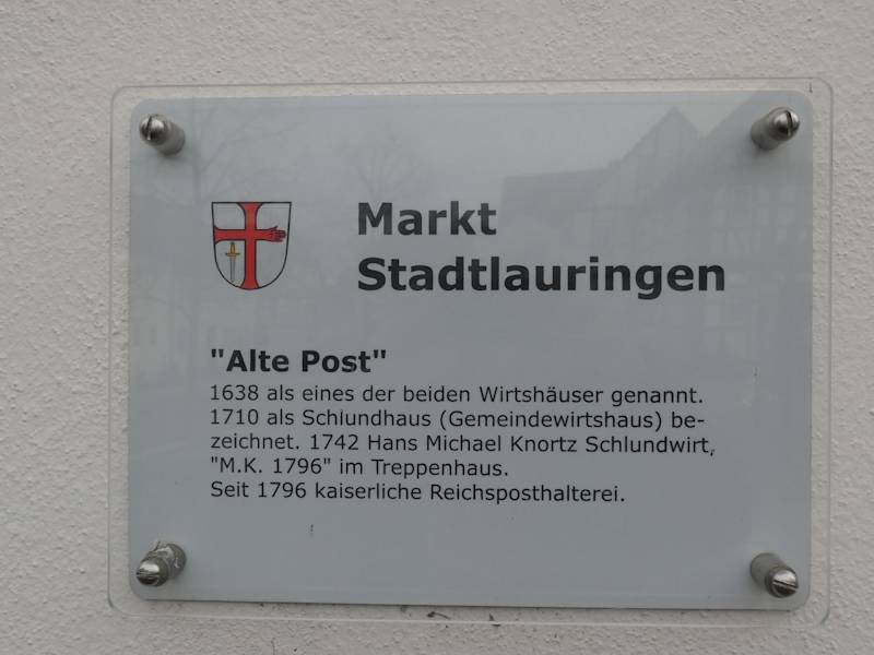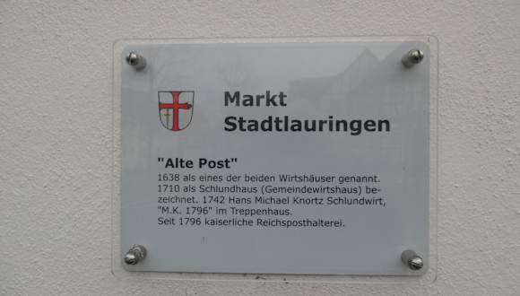 Wie man auf der INFO-Tafel, die sich in Stadtlauringen am Haus Marktplatz 17 befindet, lesen kann, wurde dieses Haus 1638 als Wirtshaus genannt. 1710 wurde es als Schlundhaus (also als Gemeindewirtshaus) bezeichnet. Den Namen Alte Post trägt dieses Bauwerk jedoch deswegen, weil dieses Haus 1796 zur kaiserlichen Reichsposthalterei wurde. Wenn man in Stadtlauringen am Marktplatz ist, so bietet sich der eine oder andere Blick zur Alten Post an.