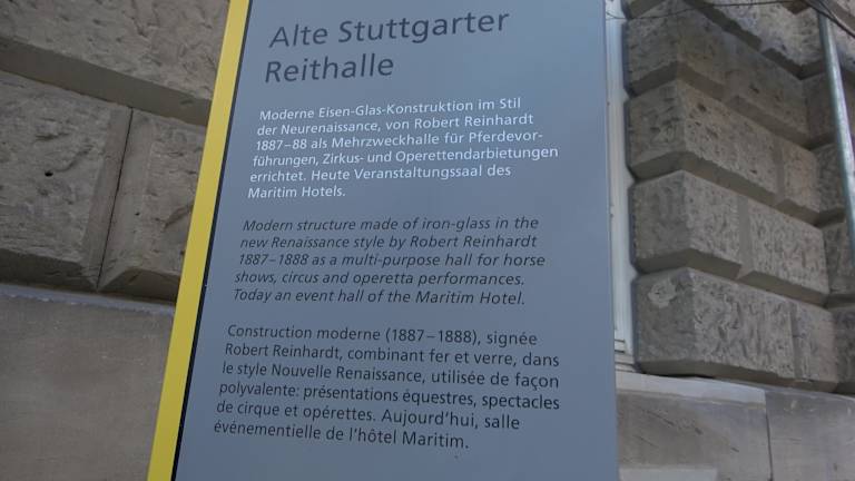 Das Stahl-Glas-Gebäude wurde in den Jahren 1887/88 im Stil der italienischen Renaissance erbaut. Vorbild war eine moderne Mehrzweckhalle, die neben Reitsportveranstaltungen, Pferdevorführungen, auch Zirkus- und Operettendarbietungen bieten konnte. 1926 erwarb Bosch die Reithalle. 1969 erwarb das Land die Halle. Lange diente sie als Lagerstätte. 1990 wurden Renovierungsmaßnahmen durchgeführt. Heute ist die Alte Reithalle in den Stuttgarter Maritim-Hotelkomplex integriert und dient diesem als Bankettsaal. Das Gebäude steht unter Denkmalschutz. Adresse: Forststraße, 70174 Stuttgart Webseite: https://de.wikipedia.org/wiki/Alte_Reithalle_(Stuttgart) Geodaten: Q5J8+7R Stuttgart