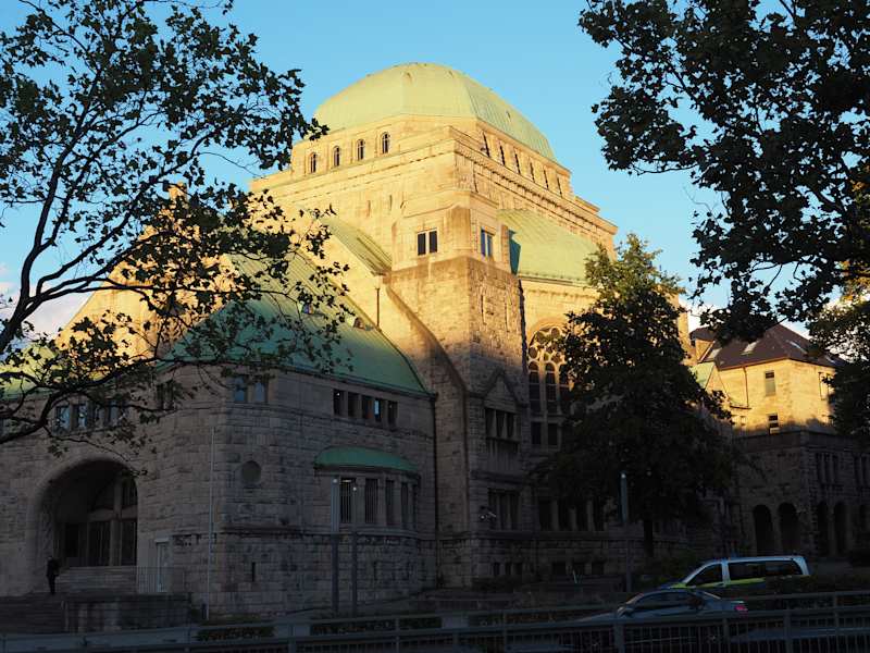 Die Essener Synagoge wurde von 1911 bis 1913 erbaut und war eine der schönsten und größten in Deutschland. Seit 2010 ist die Synagoge zum Haus jüdischer Kultur erweitert und zeigt Ausstellungen zur jüdischen Kultur und zur Geschichte der jüdischen Gemeinde Essen. Bei meinem Besuch im April 2025 konnte man von dem imposanten Gebäude aber leider nicht viel erkennen, weil die Synagoge zur Renovierung völlig eingerüstet war.