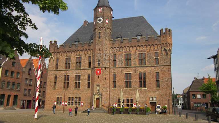 Das etwas holprige Pflaster im historischen Stadtkern von Kalkar könnte auch aus dem 13. Jahrhundert stammen, als Kalkar gegründet wurde. Aber anders als einige historische Bauten, die tatsächlich Jahrhunderte alt sind, ist der Platz um die 450 Jahre alte Gerichtslinde vor dem Rathaus wohl eher aus jüngerer Zeit und soll lediglich den ursprünglichen Charakter der schönen Innenstadt unterstreichen. Neben dem spätgotischen Rathaus mit Belfried und Zinnenkranz findet man um den Marktplatz und in unmittelbarer Umgebung noch zahlreiche alte Treppengiebelhäuser, wie z. B. das heute als Stadt-Museum genutzte Haus direkt hinter dem Rathaus. Nicht weit entfernt sind weitere Baudenkmäler wie die historische Stadtwindmühle zu finden.