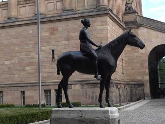 Im Kolonnadenhof, vor dem Neuen Museum, steht die Bronzeplastik Amazone zu Pferde. Louis Tuaillon schuf die lebensgroße Skulptur in den Jahren 1890 bis 1895. Eine junge Amazone reitet auf einem Pferd und hält eine Streitaxt in der rechten Hand. Als Vertreterin eines mythischen Volkes von kämpferischen Frauen ist sie ein Inbegriff von Selbstbeherrschung, Strenge und Konzentration.