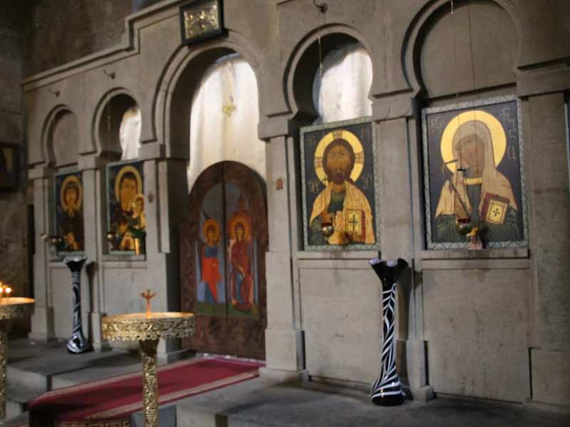 Wir gingen von der Sioni-Kathedrale zu der in der Nähe befindlichen Antschischati-Basilika. Unterwegs kamen wir bei schönen Cafes und Souvenirläden vorbei. Die Kirche liegt inmitten der Altstadt. Die Antschischati-Kirche wurde bereits im 6.Jh. als dreischiffige Basilika errichtet. Leider wurde die Kirche mehrere Male durch Kriege zwischen Georgien und den Persern und Türken im 15. bis 17. Jahrhundert beschädigt. Früher wurde die Kirche nach der heiligen Maria benannt. Im 17. Jahrhundert wurde sie jedoch "Anchiskhati" genannt. Im Jahr 1675 wurde die Basilika vom Priester Domenty um einen freistehenden Glockenturm aus Ziegeln ergänzt. Unsere Reiseleiterin erzählte uns, dass die Kirche während der Sowjetzeit als Kunstatelier missbraucht wurde, kehrte jedoch nach der Unabhängigkeit zu ihrem ursprünglichen Zweck als Kirche wieder zurück. 1958 wurde die Kirche anlässlich des 1500-jährigen Jubiläums von Tiflis komplett restauriert. Bei der Restaurierung wurden die ältesten Schichten des Gebäudes gefunden, die Bodenspuren und Fragmente der Fresken aus dem 17.Jh. Man betritt die Kirche durch den Glockenturm, der ein schmiedeeisernes Gatter mit Weintraubenmuster hat, von der Shavteli Street aus. Das Innere der Kirche war sehr dunkel, also mußten sich zuerst die Augen an diese Dunkelheit anpassen. Bei unserem Besuch der Kirche fand gerade eine Taufe statt und der weltberühmte Chor der Antschischati-Basilika sang bei dieser Feierlichkeit. Der Antschischati Chor pflegt mittelalterliche polyphone Kirchen- und Volksmusik aus Georgien. Er wurde 1989 gegründet, unmittelbar nachdem in Georgien die Ausübung von Kirchenmusik wieder erlaubt war. Ich fragte den Chorleiter ob ich photographieren darf, er nickte. Im Jahr 1999 eröffnete der Antschischati-Chor das Internationale Festival Orthodoxer Musik in Moskau. Die Antschischati-Kirche war sehr prunkvoll geschmückt, und die vielen Ikonen und Heiligenbilder gaben einen Eindruck von der tiefen Gläubigkeit der Menschen. Immer wieder kamen Menschen herein, steckten eine Kerze an und beteten vor den Bildern der Heiligen. Der Gesang des Antschischati-Chors hat mich besonders beeindruckt.