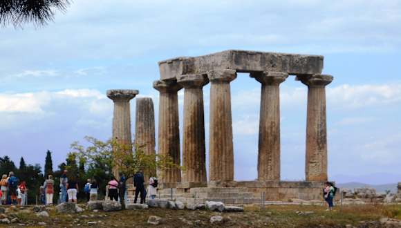 Oberhalb des ehemaligen Marktplatzes („Agora“) zeugen die verbliebenen sieben Säulen des Apollon-Tempels von der Größe und Bedeutung der Stadt Korinth in der Antike. Der dorische Tempel wurde in der Mitte des 6. Jahrhunderts vor Christus errichtet, als Korinth auf der Höhe seiner Macht war. Die verbliebenen Säulen bilden heute das Wahrzeichen der Ausgrabungen der antiken Stadt und empfangen den Besucher direkt am Eingang zur Ausgrabungsstätte.