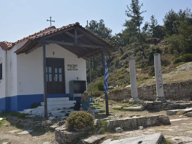 Die Apostelkirche liegt am Kap Evraiókastro. Man erreicht sie, indem man bis zum äußersten Ende des Kriegshafens läuft und dort an einem Restaurant vorbei um die Kap-Spitze herum geht (die Kirche liegt oberhalb). Oder aber man nimmt hinter dem Kulturzentrum die am Berg entlang verlaufende Straße Petrou Axioti, die später – am Hermes-Tor vorbei – zu einem Feldweg wird (ab hier ca. 200 m). Ursprünglich gab es am Standort der Apostelkirche ein antikes Heiligtum. Auf dessen Ruinen (von denen allerdings nichts mehr zu sehen ist) wurde im 5. oder 6. Jahrhundert eine frühchristliche Basilika errichtet. Von dieser Kirche verbleiben zwei Säulen und Mauerreste. Die hübsche kleine Apostelkirche zwischen den wenigen Ruinen ist auf jeden Fall ein Blickfang und einen Besuch wert. Geht man oberhalb der Kirche den Feldweg weiter hinauf, trifft man auf beeindruckende Reste der ehemaligen Stadtmauer und kommt letztendlich zum Amphitheater.