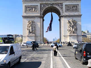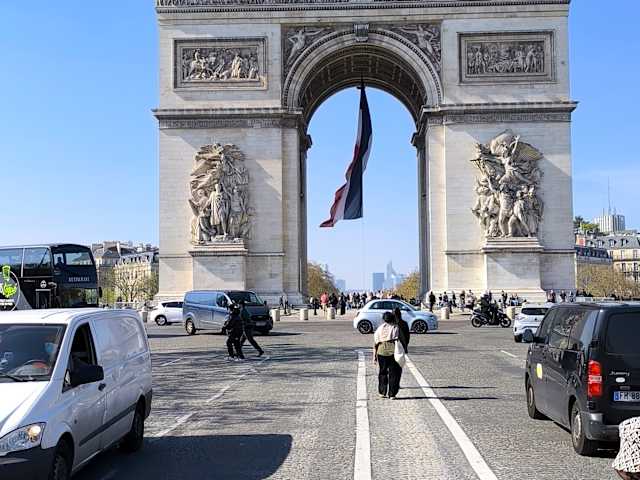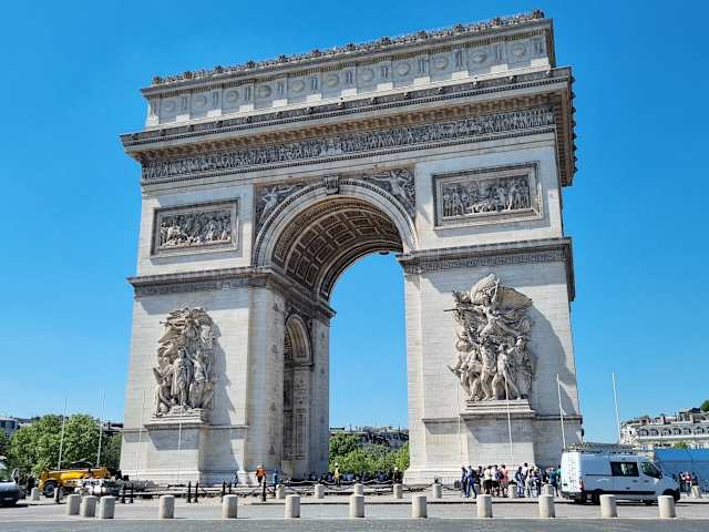 Berühmter Bogen mit Denkmal des unbekannten Soldaten und Relief de la Marsellaise. Es ist direkt unterirdisch mit dem Metro verbunden. Man kann hoch fahren und es lohnt sich. Es gibt Kontrollen wie im Flughafen. Oben angekommen sieht man tout Paris. Alle Verkehrsachsen und die Champs Elysées. Die Treppen sind viele, es gibt ein Fahrstuhl, den benutzt man ungern aber wenn man höflich fragt, es klappt