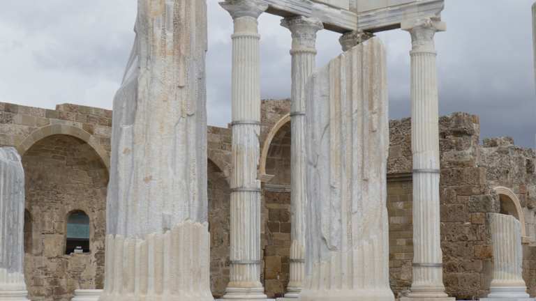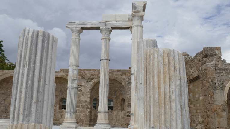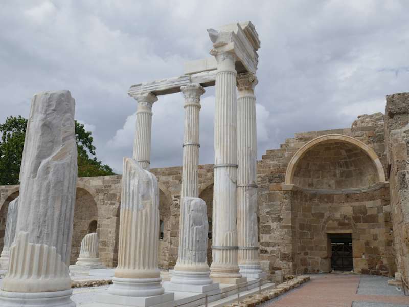 Dieser Tempel steht ganz in der Nähe des Apollontempels, aber er steht auf seinem eigenen Areal. Zur Unterscheidung zum Apollontempel hat man ihm 4 Säulen hinzu gefügt. Athena war nach der griechischen Mythologie die Göttin der Weisheit, auch die Göttin des Kampfs, der Künste und des Handwerks. Der Tempel auf der Akropolis in Athen ist doch die Athene, deshalb sind die Reste ihres Tempels in Side so wichtig für diese Göttin. Ihre römische Art war die Minerva.