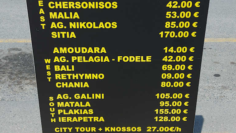 Diesen Ausflug auf eigene Faust unternehmen. Das Busnetz ist gut ausgebaut . Die Busse sind klimatisiert, modern und fahren pünktlich. Der Fahrpreis beträgt ab Malia 4.20 Euro für eine erwachsene Person und vom Busbahnhof erreicht man das Stadtzentrum mit Hafen in wenigen Minuten. Auch Knossos ist mit der Buslinie 2 gut erreichbar.