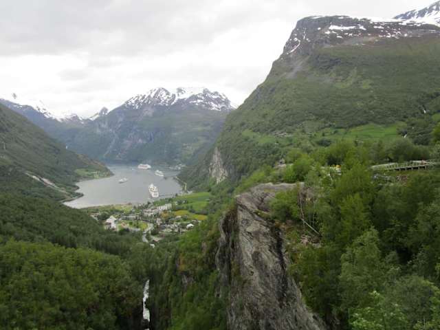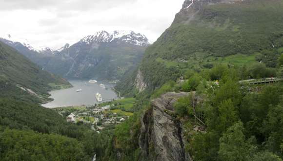 Der Aussichtspunkt Flydalsjuvet über Geiranger bietet einen imposanten Anblick und das wohl meisten benutzten Motive der norwegischen Touristenwerbung. Der Aussichtspunkt ist von der Straße 63 leicht zu erreichen und ca. 4 km von Gerianger. Wenn Kreuzfahrtschiff in den Sommermonaten vor Anker liegen kann es sehr voll am Flydalsjuvet werden und Parkplatzmangel aufkommen. Aber die Top Aussicht entschädigt alles.