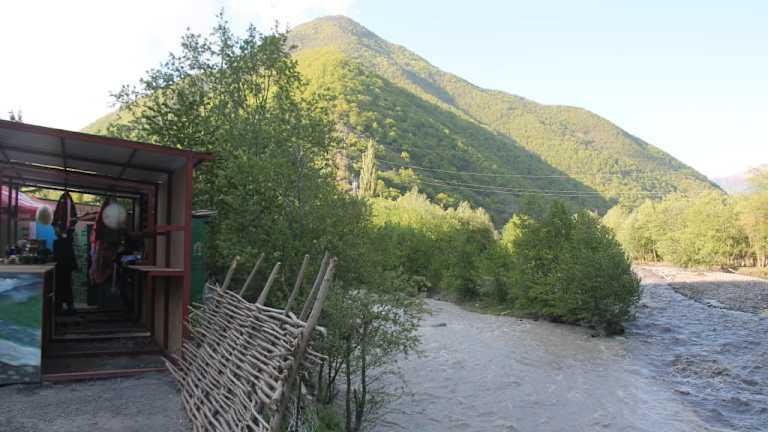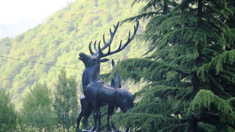 Etwa 30 km Fahrt von Ananuri entfernt, machten wir einen kurzen Stopp bei der kleinen Ortschaft Passanauri. Diese Aussichtsstelle an der Georgischen Heerstraße war mit einer Hinweistafel gekennzeichnet. Auf der Tafel ist vermerkt „ Pasanauri White & Black Aravi „. Neben dieser Aussichtsstelle befindet sich ein Kiosk und 2 Hirsch-Statuen. Die Ortschaft Passanauri liegt in einer kleinen Talweitung und ist von 2600 bis 2800 Meter hohen Bergen des Großen Kaukasus umrahmt. Passanauri ist bekannt für seine malerische Landschaft und die Nähe zu historischen Orten. In der früheren Sowjetunion war Passanauri als Touristenort bekannt, verarmte jedoch nach deren Zerfall. Im Jahr 2002 hatte das Dorf nur noch1600 Einwohner. Unsere Reiseleiterin erzählte uns, dass es in Passanauri möglich ist, eine Rafting tour zu machen. Wir können das jedoch nicht bestätigen. Bei Passanauri fließen der Weiße oder Mtiuleti-Aragwi und der Schwarze oder Gudamaqri-Aragwi zum Aragwi (bzw. auch Aragvi genannt) zusammen, einem linken Nebenfluss der Kura (Mtkwari). Der Weiße Aragwi entspringt in ca. 3.000 m Höhe wenige Kilometer von Dshwari-Pass entfernt. Der Schwarze Aragwi ist der längere der beiden Quellflüsse, er entspringt weiter östlich im Kaukasus. Seine Quelle liegt in einer Höhe von 2.865 m auf der südlichen Abdachung des Hauptkamms des Großen Kaukasus. Der Schwarze Aragwi ist 56 km lang, womit sich eine gesamte Länge des Aragwi von 112 km ergibt. Man sieht sehr deutlich den Unterschied in den Farben der Flüsse. Manche Leute vergleichen es mit Yin und Yang. Nach einiger Zeit vermischt sich der Fluss allmählich und wird zu einer Farbe. Die Mündung des Aragwi in den Mtkwari bei Mzcheta ist historisch, kulturell, kirchlich und touristisch ein wichtiger Ort für Georgien. Die frühere georgische Hauptstadt Mzcheta liegt westlich der Mündung. Auf der anderen Seite des Fluss liegt das Dshwari-Kloster (Kreuzkloster) auf einem Bergsporn rund 150 m oberhalb des Flusses. Entlang des Flusses verläuft mit der Autobahn S-1 eine der wichtigsten Straßen in Georgien. Es lohnt sich, eine kurze Pause bei dieser gut gekennzeichneten Aussichtsstelle neben dem Zusammenfluss der Weißen und Schwarzen Aragvi zu machen.