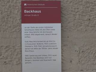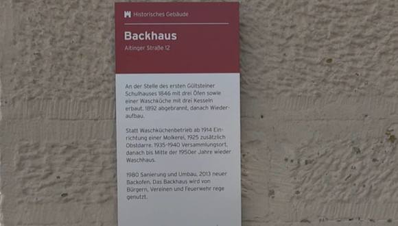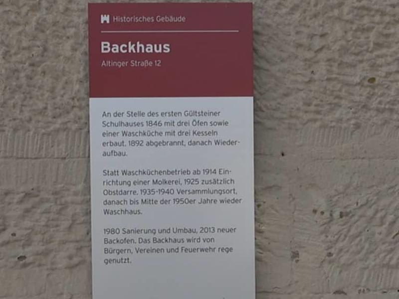 An der Stelle des ersten Gülsteiner Schulhauses wurde 1846 ein Backhaus, mit drei Öfen und einer Waschküche, mit drei Kesseln, erbaut. 1892 brannte das Gebäude ab, wurde aber wiederaufgebaut. Ab 1914 war hier die Molkerei, ab 1925 zusätzlich eine Obstdarre. Ab 1950 war es wieder ein Waschhaus. 1980 wurde es saniert und 2013 ein neuer Backofen eingebaut. Noch heute wird es von den Bürgern genutzt.