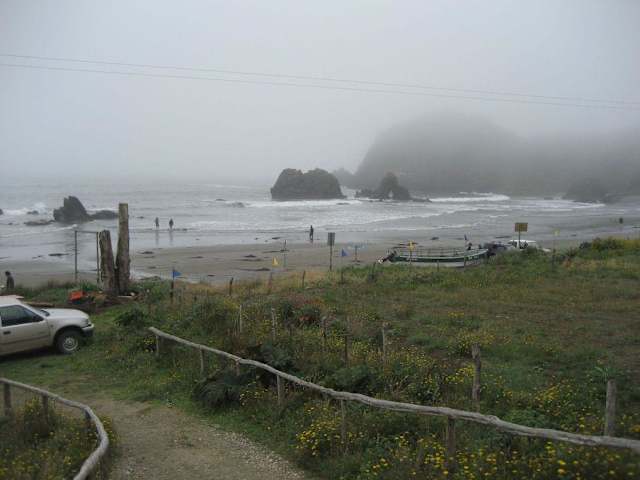 Eine Bootsfahrt zu den Pinguin-Inselchen Islotas de Puñihuil macht hungrig. Am langgestreckten Strand der Bahia de Puñihuil stehen einige urige Fischrestaurants auf Stelzen knapp über der Hochwasserlinie mit herrlichem Blick auf die Bucht und den pazifischen Ozean. Das Restaurant BAHIA PUÑIHUIL, gleich am Anfang der Bucht, bietet Meeresfrüchte satt: Viele Arten Fisch und Muscheln, auch falsche Abalones (recht zäh), denn die echten stehen weitgehend unter strengem Naturschutz, und natürlich das berühmte Curanto. Curanto ist ein traditionelles Gericht der Insel Chiloé. So wie früher, wird zur Zubereitung auch heute noch an Festtagen ein cirka 1. 50 m tiefes Erdloch ausgegraben, in das man rotglühende Steine legt und darüber abwechselnde Lagen von Muscheln, Fleisch (grobe Würste, Huhn), Fisch und Kartoffeln schichtet, jeweils getrennt durch eine Lage der riesigen Nalca-Blätter (chilenischer Rhabarber), anschließend werden nasse Säcke darüber gelegt und das Ganze mit einem Placken Erde abgedeckt. So entsteht eine Art Dampfkochtopf, in dem das Curanto gart. Heutzutage muss es meist schneller gehen und so bereitet man ein „modernes“ Curanto zeitsparend in einem normalern Dampfkochtopf zu, doch die Zusammensetzung ist weitgehend die gleiche geblieben, wenn auch die Rezepte leicht variieren können. Wichtig ist, dass von Allem etwas dabei ist. Wer das Curanto im Restaurant BAHIA PUÑIHUIL probieren will, sollte es am besten vorbestellen.
