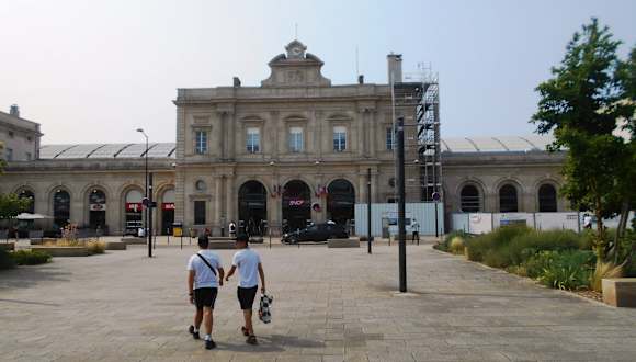 Der Bahnhof am Rande der Altstadt öffnet sich nach Süden zu der begrünten Promenade, die parkähnlich den Verlauf der alten Stadtmauer markiert. Am nördlichen Ende der Promenade steht die Porte de Mars, ein aus römischer Zeit stammenden Triumphbogen, der auch als Stadttor diente. Das Bahnhofsgebäude aus dem 19. Jahrhundert wurde während der Kriege 1870 und 1917 stark beschädigt und in den Jahren 1932–1935 wiederaufgebaut. Im Inneren wurde der Bahnhof modernisiert und bietet einen guten Service.
