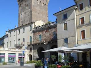 Das Straßencafé an der Piazzale Alcide De Gasperi bietet einen Blick auf die Stadtmauer, das Stadttor Porta di Castello und den Turm Torrione di Porta Castello – eine interessante Nachbarschaft und ein guter Platz um ein Sandwich oder einen anderen kleinen Imbiss zu genießen.