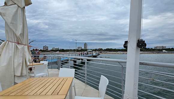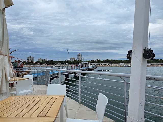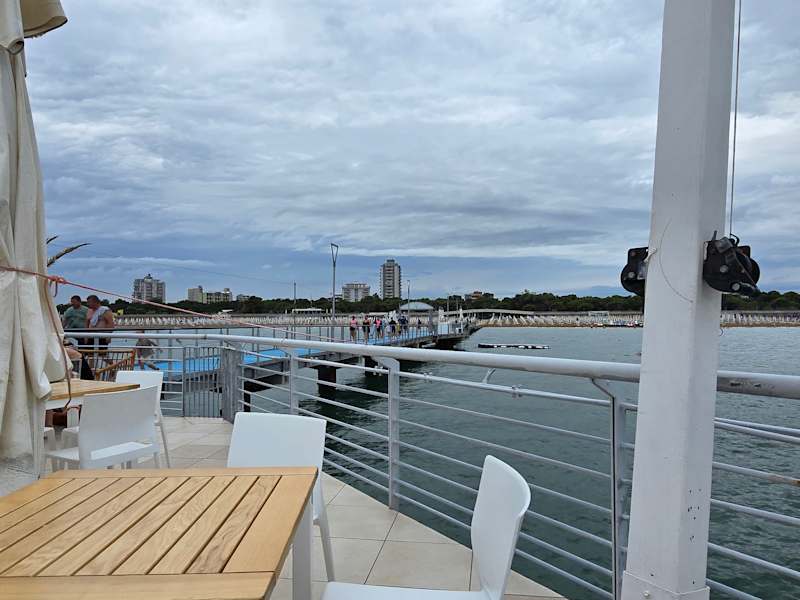 In Lignano Sabbiadoro besuchte ich die Strandbar La Pagoda, der Steg geht weit ins Meer hinaus, um das Restaurant kann man gemütlich sitzen und so weit das Auge reicht raus auf das Meer schauen, es ist dort Selbstbedienung angesagt. . Internet: lignanosabbiadoro. it/de/strutture/la-pagoda/